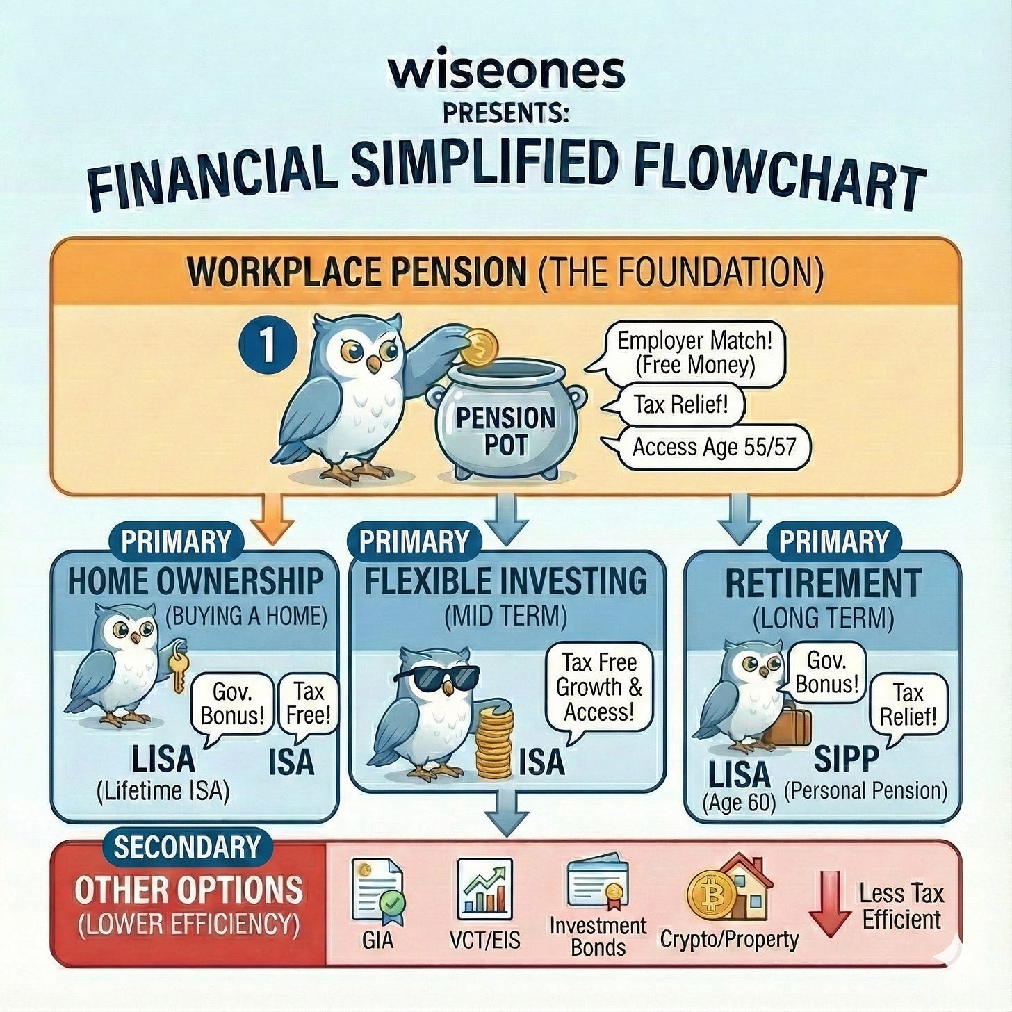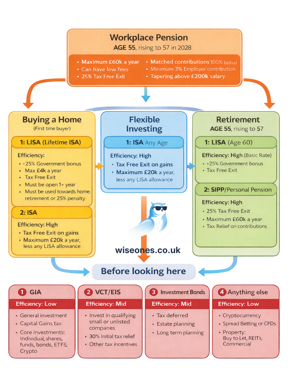 The flowchart sets out a logical investment hierarchy, based on access age, tax efficiency, and purpose.